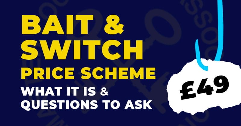 The bait and switch price scheme is a scam where a customer is lured in by an initial cheap price advertised, only to be hit with a bill that is more often than not a minimum of 10 times more expensive than the advertised fee!
